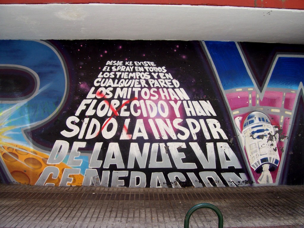 A pesar de que las tropas de ocupación del imperio están bien acantonadas en los lugares estratégicos de nuestra psique colectiva, bombardeándonos sin descanso a través de los medios de comunicación con las narrativas de la mitología capitalista, los mitos más hondos del pueblo siguen siendo otros. Leyendas del vandalismo, de la delincuencia, de la militancia, del valor suicida o del graffiti. Recuerdo, por ejemplo, pasear en búsqueda de las pintadas que Mast nos regalaba a todo Móstoles. Sin duda algo mucho más valioso que cualquier autógrafo. Los testigos se cogen. Como dice un graffiti de la Elipa, son las verdaderas fuentes de inspiración de lo mejor de las nuevas generaciones.