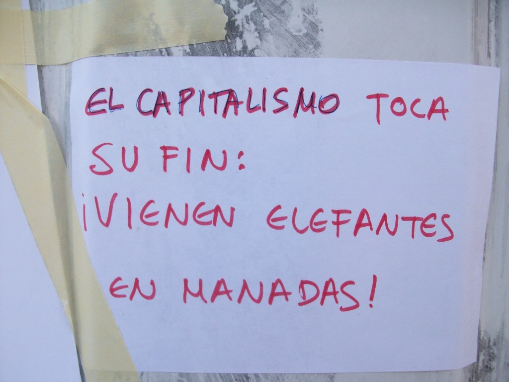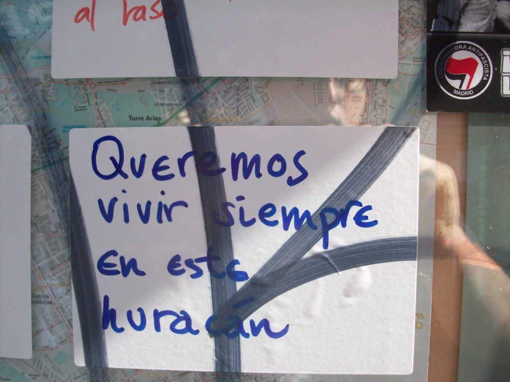 Y la asamblea, de pronto, tan obvia y natural. “Estrenando las viejas plazas que antes no eran más que melancolía y distancia organizada entre víctimas de la caída de la tarde. Alzas la mano, hablas, y continúas la evolución”. Y el delirio y el huracán, donde confluían locas manadas de ríos que desembarcaban aquí desde todos los barrios con algún don, locas manadas de ríos bailando dentro de un grito común, un grito que, por primera vez en la vida, te hacía sentir que no hay cauce para nuestra talla. Las horas tan increíbles, ardiendo tan rápido y a la vez tan despacio. La palabra liberada: en 20 minutos, las conversaciones llegaban más lejos que en 10 años de teoría separa y encontraban el hiato, que permitía que por fin todo pasara a una escala total. Los terrenos resbaladizos, más allá de la seguridad de las ideologías. Todos desorientados, en una deriva colectiva que se abría paso a través de nuestras potencialidades redescubiertas, ampliando lo posible. Sonámbulos históricos, entre el sueño y la vigilia. Y la poesía realizada, a través de las frases, los cuerpos, las conversaciones, las actitudes y los encuentros. Un banquete de riqueza y magia repartido a venas abiertas: follar en un cajero automático, hablar intensamente con una desconocida hasta más allá del amanecer y nunca más volver a verse, tan lúcidos y descarados como dioses en plena locura de amor. Descubrir que tu familia es cualquiera, porque cualquiera está ahí para prestarte ayuda. Sin miedo a la vorágine, a perderse en el tumulto. Sin miedo, por fin, a ser una cobaya de la historia. Jugar a que todo era posible porque sin duda pensábamos que algo sería posible.