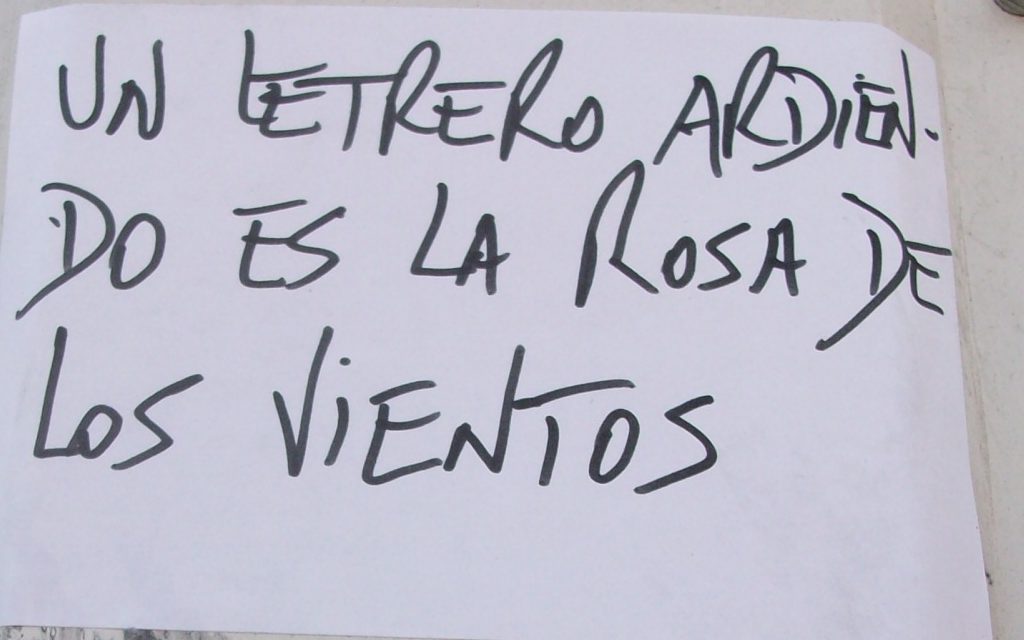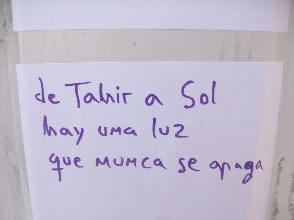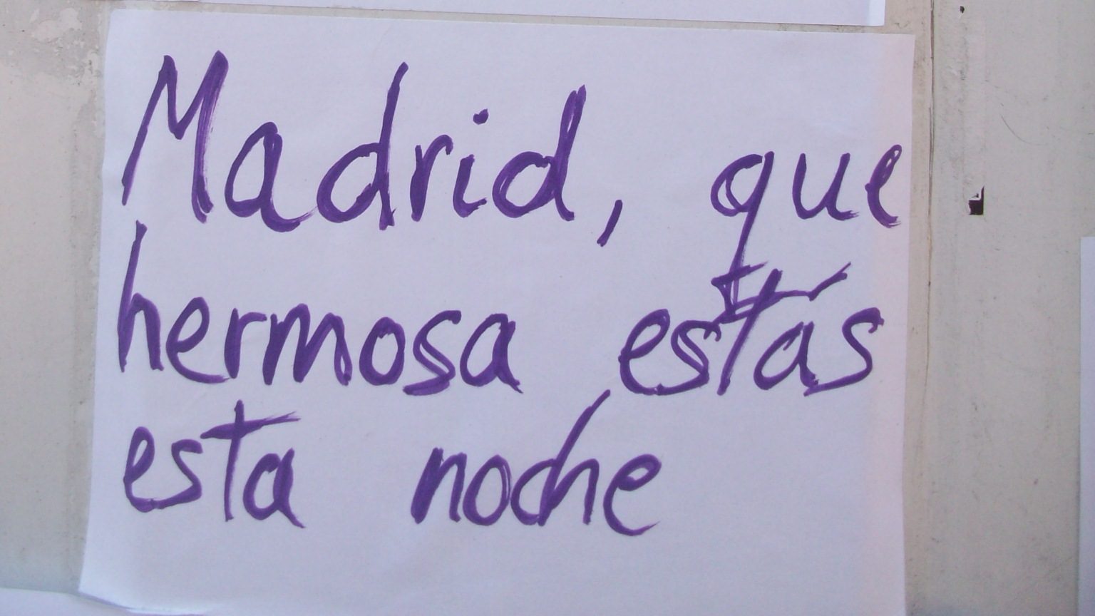 “Hoy, 18 de Mayo, a las cinco de la mañana, la asamblea general, que había empezado a las tres y media de la madrugada, seguía viva. Unas mil personas ocupaban Sol a esa hora. El paisaje era maravilloso: gente durmiendo o dormitando, o entre mantas, y de pie, deambulando, pegando carteles con consignas en términos generales imaginativas, intercambiando ideas, dueños de su cuerpo y de su sueño. Y amantes que se amaban, sí, tal cual. Un guante negro sobre cartones. Y un hombre-manta, de pie, se retrataba a si mismo porque había encontrado su nueva belleza. El cansancio fraterniza con la imaginación. El sueño vive encima del asfalto. El onirismo y la vigilia juntos: casi podría decirse que el sueño y la acción se han hermanado (¡ah, Baudelaire!) No exagero nada ¡Qué alegría! Dure lo que dure, como dice una pintada: el mundo gira alrededor de Sol”.