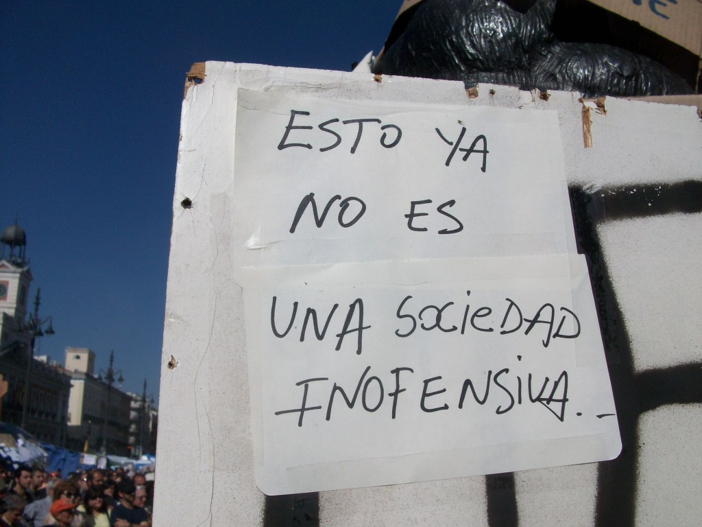 Y se levantó, en un par de días, una ciudad libre dentro de la ciudad esclavizada. Un campamento de guerra civil que sólo le faltó el valor para estallar, y quizá ese fue su mérito. Oasis de utopía: la plaza se transforma en un arrecife selvático, exuberante, laberíntico, hirviente de color, de comunicación y sorpresas. La impresión era unánime: a pesar de la precariedad, aquel poblado chabolista que conformó la ciudadela de Sol tenía algo que era hermoso y turbador, incluso estéticamente. Había gente que simplemente pasaba las horas, paseando por allí como quien pasea por un bosque dorado en Noviembre.