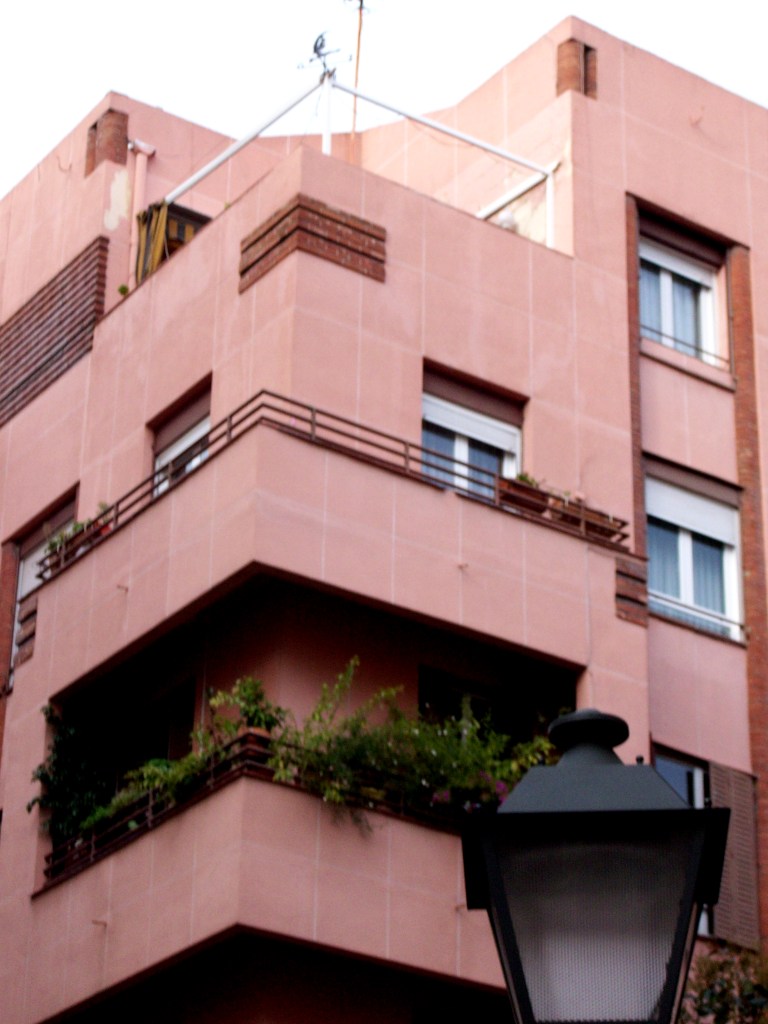 Mi segunda visita a la plaza de Olavide tampoco fue buscada. La encontré tras un desvío fortuito en un paseo con otros objetivos. Entonces volví a comprobar, ahora con cierta predisposición, la manera naval de aquellas casas. Llamó mi atención especialmente una, de color rosado, que se encuentra en una de las bocacalles que dan a la plaza. En su forma se puede distinguir una proa, un puente, una borda y otros elementos náuticos, esta vez no asociados a un barco pesquero, sino a un trasatlántico, con su componente de huida, de salto, de migración y cambio de vida. Un foco de infección de deseos marinos. Para el viaje interior.