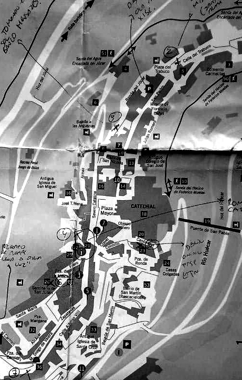 Desayunando en el café de Los Arcos, en la Plaza Mayor, establecimos una serie de reglas básicas que nos permitieran enfrentar la batida como un juego. Sobre un plano turístico del casco antiguo, marcamos cada uno cinco puntos al azar, con los ojos cerrados, y los numeramos. Un procedimiento que ya había probado previamente en Valencia con una amiga y en Aranda de Duero con la propia Xisela y que en ambos casos tuvo efectos asombrosos. En los puntos marcados debíamos encontrar alguna pista, indicio o señal reveladora, que esta vez tendría que estar relacionada específicamente con el mundo de los sueños. La idea de localizar previamente los yacimientos oníricos, como si fueran tesoros, era educar la mirada para lo maravilloso común. Empujar a despertar todas aquellas riquezas de lo posible que tendemos a despreciar. Curiosamente, aunque no siempre fue evidente de inmediato, en todos y cada uno de los puntos descubrimos algo que hoy podemos considerar un tesoro, aunque es obvio no en todos ellos lo maravilloso resplandecía con la misma intensidad.