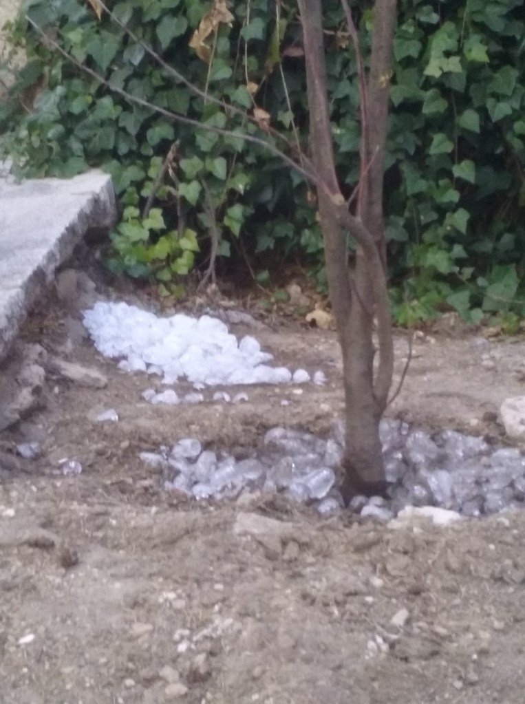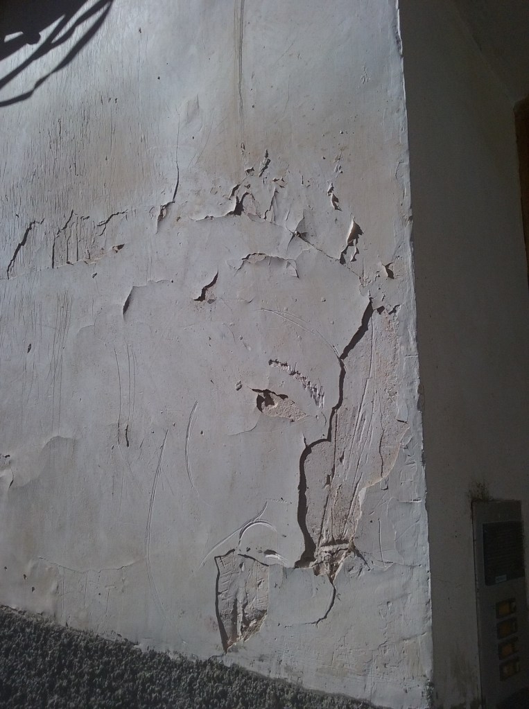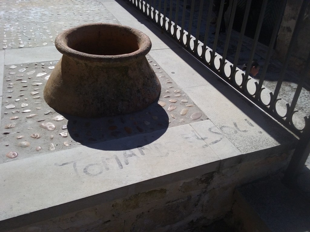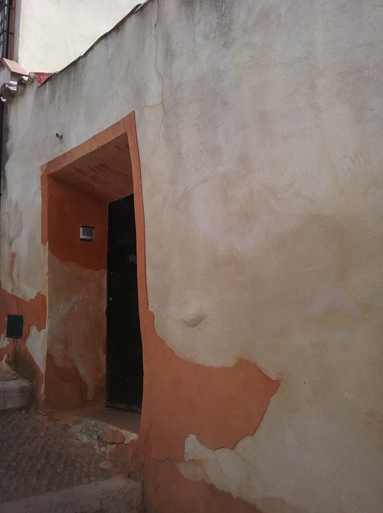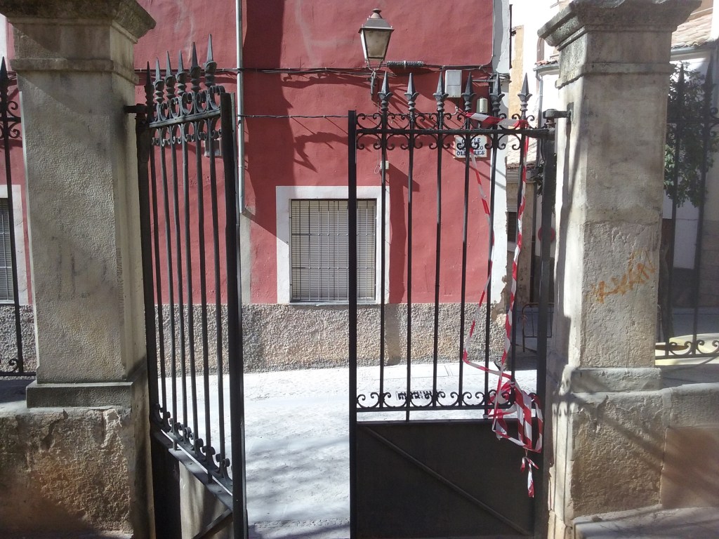 Una vez en la zona más elevada, en la calle Trabuco, la X número 2 marcada en el plano nos señalaba un patio profundo como un pozo que abría un hueco imprevisto entre las casas. En el fondo del patio, un árbol. Abordado el lugar horas más tarde desde otro ángulo, más lateral, vimos que el árbol estaba protegido por dos muros cerrados, como si se tratara de un objeto sagrado, peligroso o muy preciado. Al final del día supimos que ese patio profundo era una reminiscencia arquitectónica del antiguo foso de la ciudad.