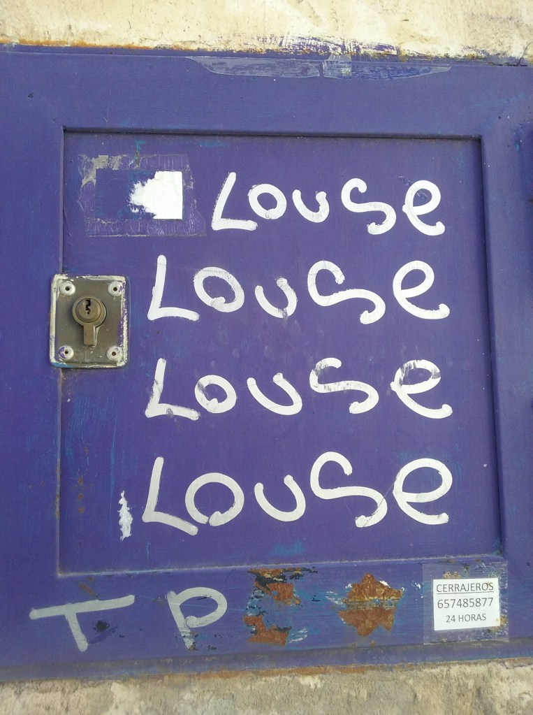 Comenzando la batida, pronto nos encontramos con el punto número 10 que estaba marcado en el mapa: la plaza de El Salvador. A un lado, una pared con una grieta que nacía de una lámpara, lo que confería al resquicio el aspecto de un relámpago. Enfrente, un cartel vacío, como un signo del fracaso del lenguaje y la comunicación. En una extraña ventana con cerradura, pintada obsesivamente en francés la palabra louse (piojo). Cerrando la plaza, una iglesia con una puerta en ese momento perfecta para apoyarse a tomar el sol. Se respiraba en el lugar un cierto aire de invitación a la profanación religiosa, y el triángulo entre tres de los vértices simbólicos de la plaza, el cartel vacío, la iglesia solárium y los piojos me hacían pensar en el segundo canto de Maldoror: ese aullido de incomunicación atea que canta como Maldoror fecunda un piojo hembra para destruir a la humanidad. Pero el lugar no presentaba ninguna conexión o analogía evidente con ningún sueño (en mis sueños sí suelen aparecer tormentas como paisaje de fondo, pero el rayo por sí solo no decía mucho). Más tarde ese mismo día supimos que hasta dos veces las torres de la catedral de Cuenca habían sido impactadas por rayos que habían desencadenado portentosos incendios, lo que terminó de conferir a la plaza la solemnidad psicogeográfica de un memorial al terrorismo deicida.