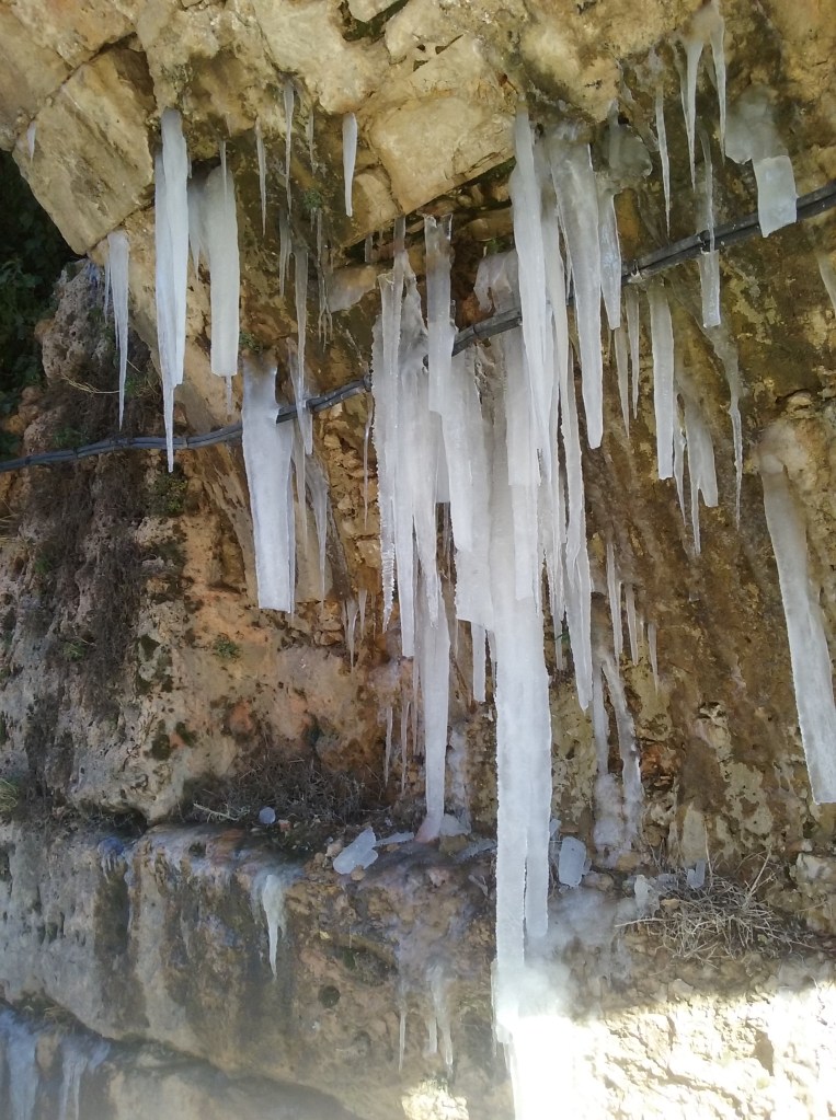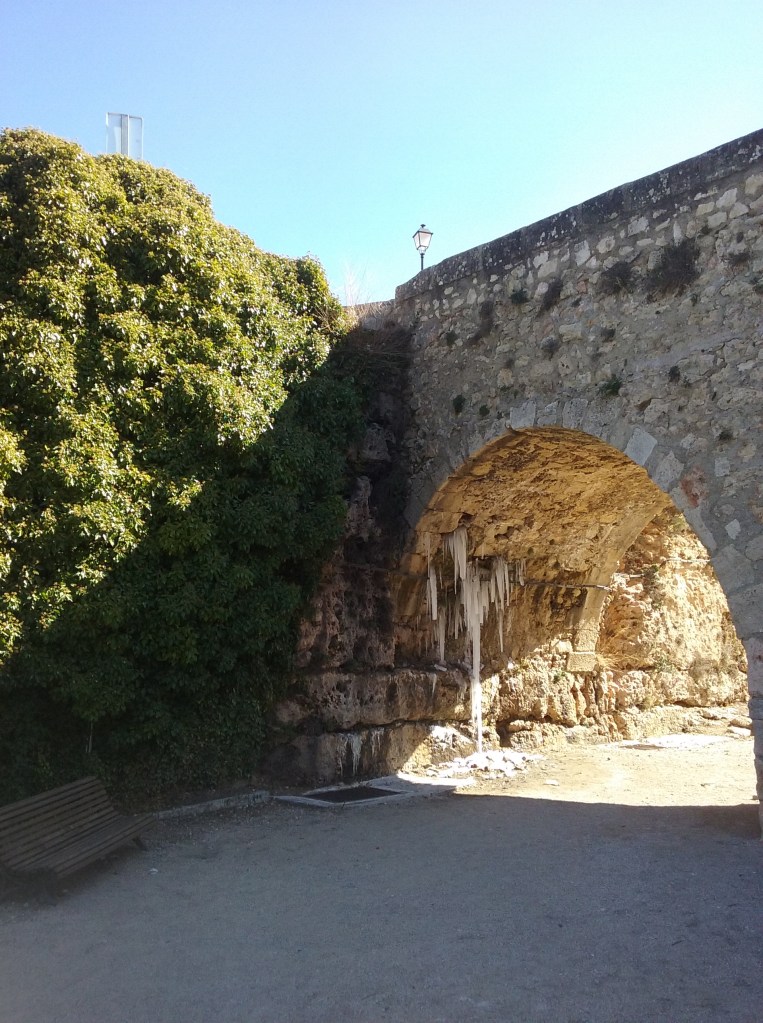 Saliendo después por el Arco de Bezudo y cruzando el puente de entrada que salva el foso de la ciudad, se encontraba el tesoro señalado con el número 1 en el plano, un poco antes de que la calle Trabuco se bifurcara en el camino de San Isidro y la Calle Larga. Justo allí, un cartel anunciaba el comienzo del Sendero del Agua Encantada del Júcar. El hallazgo parecía de por sí atractivo por el mismo nombre de la senda. Pero unos segundos más tarde se convirtió en un hiato de belleza estremecedora: bajo el ojo del puente, apenas a unos metros del cartel, una cascada onírica de estalactitas de hielo. Pura expresión de agua encantada. Tras el descubrimiento del tesoro número 5 horas después cabría interpretar este lugar como la fuente de la eterna juventud.