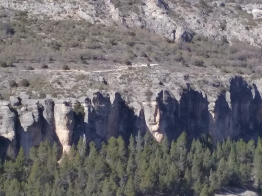 Unos metros más allá, y explorando un poco el sendero del Agua Encantada, la hoz del Júcar se me presentó presa de una potente alucinación onírica. Vistas de lejos, las formas de las rocas se asemejaban a moais rapanui esculpidos en la montaña. Las figuras de moais de isla de Pascua, que me han fascinado desde pequeño, suelen presentarse en mis sueños con cierta frecuencia, aunque siempre a distancia, inalcanzables, como de fondo. La última, uno en el paseaba con mi padre buscando el mar y en el que los montes que rodean Ferrol estaban repletos de moais combinados con otros tótems y enormes atracciones de feria en ruinas.