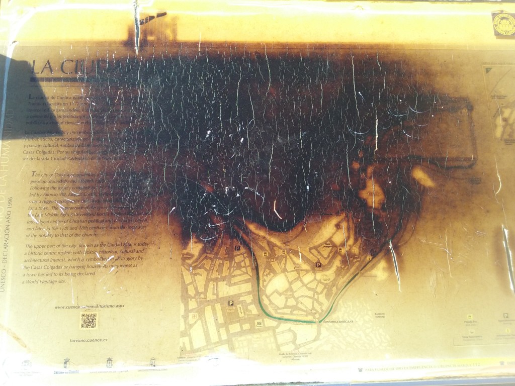 De vuelta a la ciudad, en la entrada de la puerta de Bezudo, reparamos en un plano quemado en el que el dibujo de las calles se había ennegrecido y distorsionado, como ocurre con las ciudades familiares en los sueños.