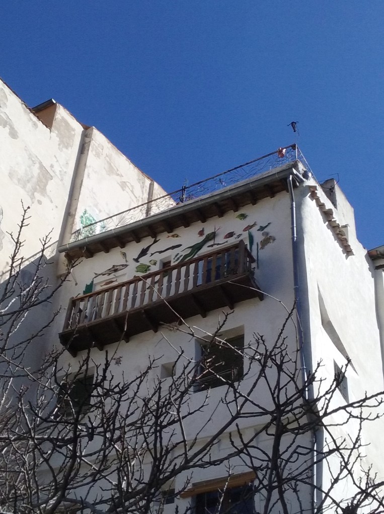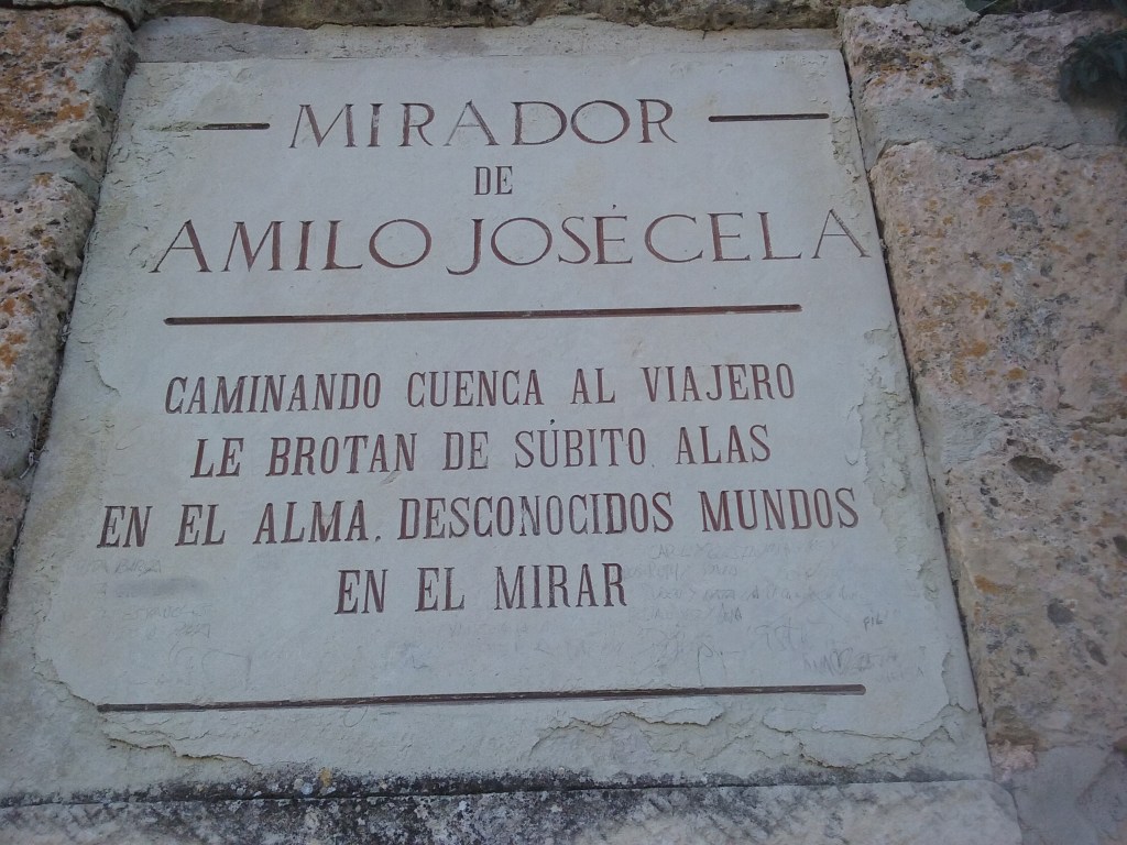 La ola onírica de Xisela encarnada en casa, que habíamos intuido vagamente en la calle Mosén Diego de Valera, se mostró sin ningún género de dudas en la parte de la calle Trabuco que desciende estrecha y peatonal por la ladera de la hoz del Júcar, junto al mirador Camilo José Cela. Allí una casa blanca, alrededor de un balcón de madera, de la que colgaban más de una docena de figuras de animales acuáticos: pez martillo, tortuga, pulpo y otros muchos peces como los que se podían observar en las paredes de agua semidetenidas de los sueños de Xisela. Unos metros más al sur, en el mirador, una pequeña placa con una cita de Camilo José Cela, que a pesar de encontrarse en las antípodas del surrealismo, nos pareció muy bien afinada con la música de la batida y el sentido de su búsqueda: “Caminando Cuenca al viajero le brotan de súbito alas en el alma, mundos desconocidos en el mirar”.