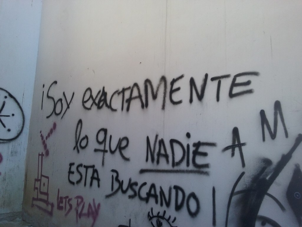 Como en un altar de frases, descubrimos alrededor del mirador algunas pintadas convencionales, típicas de jóvenes con deseos de abrir su percepción, pero que condimentaban bien el momento y su misión: “instantes” “desaprende” “desintoxícate de la realidad” “vuelve a nacer”. También otra menos evidente “soy exactamente lo que nadie está buscando”. Esa frase nos hizo sentir la tristeza de que un comportamiento como el nuestro fuera seguramente muy extravagante entre los muchos turistas que paseaban esa mañana Cuenca. Lo que nos llevó a pensar en cómo eso hablaba mal de las posibilidades emancipatorias de nuestro tiempo.