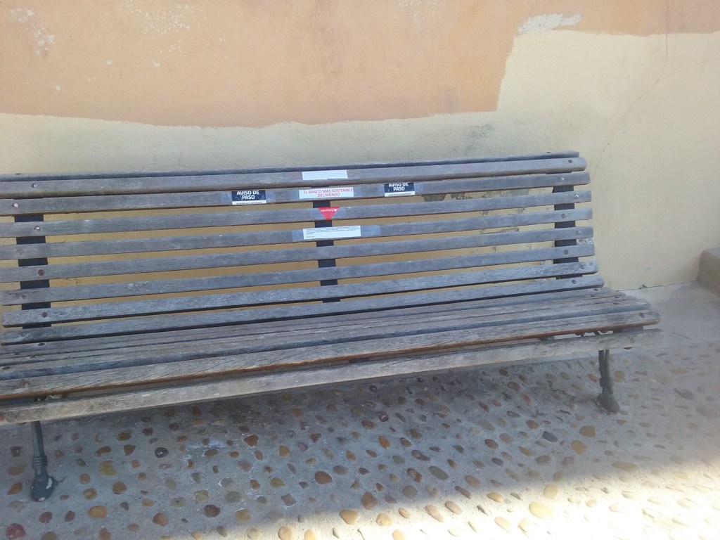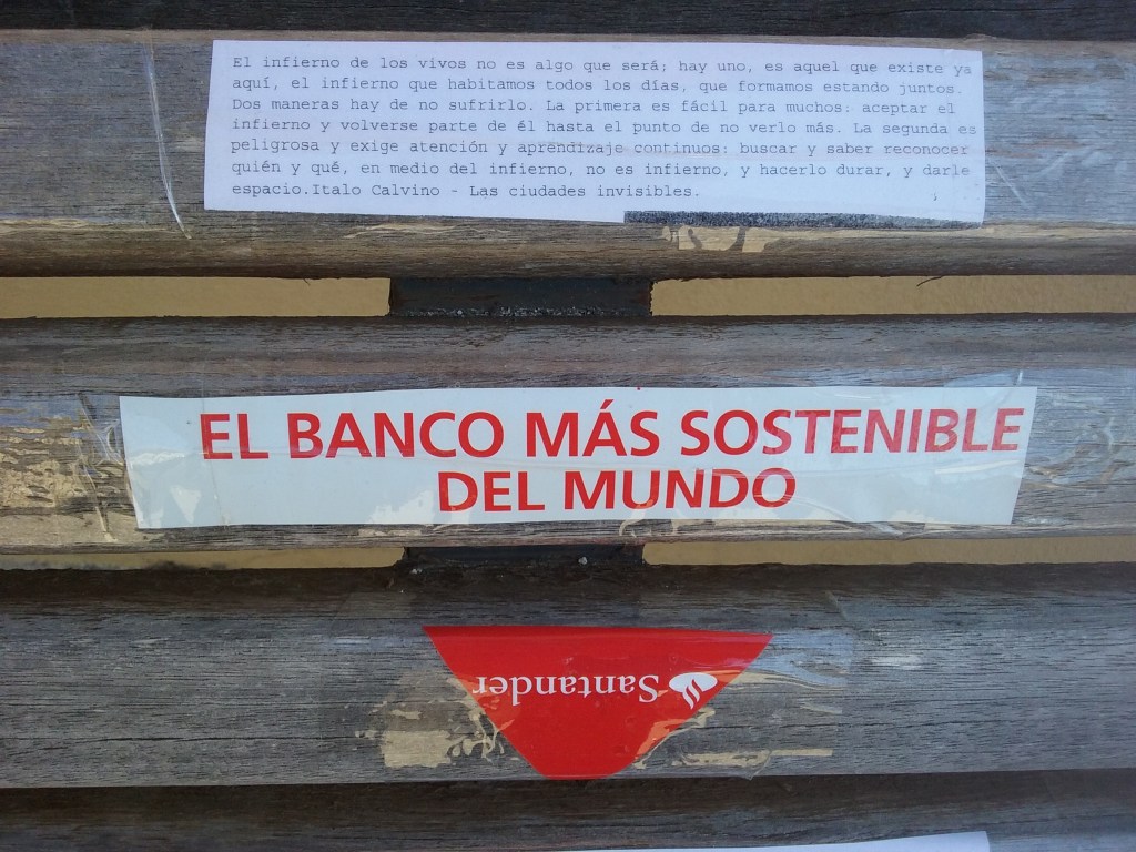 Tomando la calle Severo Catalina, frente a la Fundación Antonio Saura, estaba el tesoro señalado en el punto número 3: un banco, que tenía adheridos una serie de mensajes. “El banco más sostenible del mundo”, como se hacía llamar, lucía una alerta de “atención nota importante, aviso de paso”. Que ese aviso de paso importante se encontrara en unos de los puntos marcados aleatoriamente en el plano se nos antojó hermosamente perturbador, y prestamos la máxima atención.