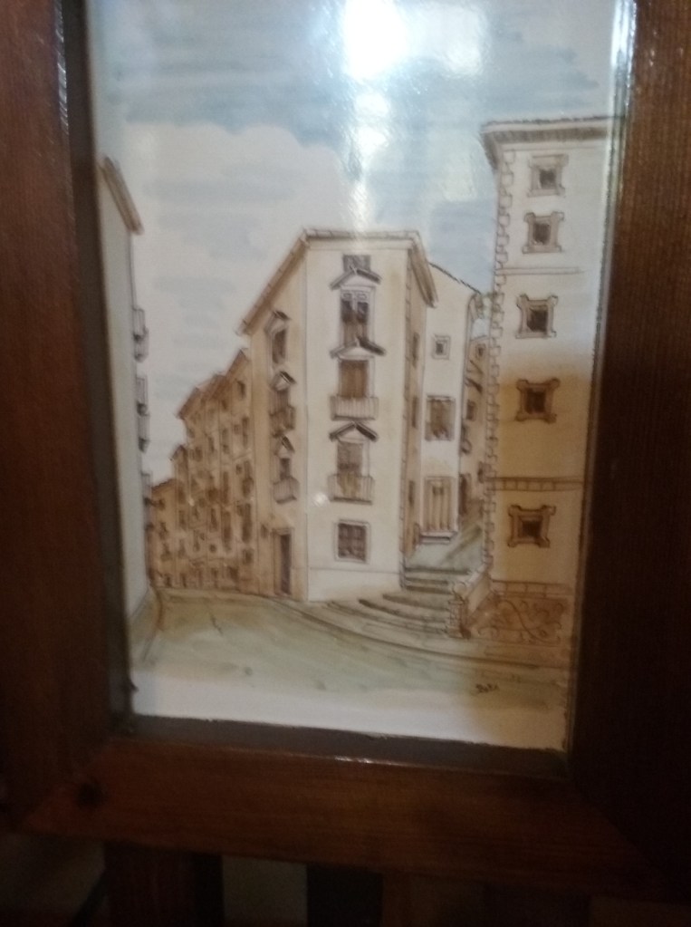 Como necesitábamos reposar la intensidad de lo vivido, y se acercaba la hora de comer, decidimos poner en pausa la batida, dando aun un pequeño rodeo por el barrio de San Miguel hasta encontrar un restaurante más económico y menos atestado fuera del casco viejo. Por el camino, sin pretenderlo, realizamos algunos descubrimientos distraídos: una pintada que enunciaba un “amor consciente hacia todo”; una placa de “la unión y el fénix español”, que luego supimos que se trataba de una desaparecida compañía de seguros, pero en el momento nos sugería la sede de una sociedad iniciática fascista. En el restaurante, que estaba adornado con grabados de elementos pintorescos y emblemáticos de la ciudad, como las casas colgadas, casualmente el camarero nos sentó justo debajo de un pequeño dibujo de La casa de las fiestas-Rompe el Círculo.