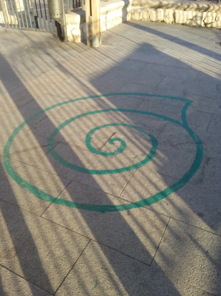Tras una breve siesta en el hotel, retomamos la batida un poco antes de las cuatro de la tarde. En la subida de la calle Alfonso VIII, en el punto marcado en el plano con el número 7, encontramos la entrada a un parking: un enorme túnel que se abría como una boca o cueva que penetraba en las entrañas de ciudad. Animé a Xisela a sospechar que quizá el tesoro no se encontraba solo ahí, ya que como es propio en una ciudad-escalera como Cuenca, construida a varios niveles, debíamos considerar las tres dimensiones del espacio. Y justo encima de la entrada del túnel se podía ver una plaza con un balcón. Llegamos a ella, la Plaza del Carmen, y descubrimos en el suelo el dibujo de una concha-espiral, que se situaba justo por encima de un punto en el que túnel por debajo del suelo había recorrido una decena de metros. Ambos elementos se asociaron inmediatamente en mi mente con un lugar que ya habíamos visitado, no en sueños sino en la vigilia, pero en un estado de fuerte ensimismamiento erótico, y era muy importante en nuestra historia amorosa: el palacio de Quinta da Regaleira, en Sintra, y su pozo de iniciación, al que se accede por un túnel. Más tarde, reflexionando sobre este hallazgo, me he dado cuenta que la arquitectura del túnel que penetra en las profundidades y el ascenso espiral a la superficie es exactamente la arquitectura de muchos de mis sueños. Cada cierto tiempo tengo lo que he denominado sueños por capas: normalmente pesadillas, de las que voy despertando en una cama, pero en otros sueños, que ya no son pesadillas pero tampoco sueños agradables –es habitual que remitan a reflejos vacíos y empobrecido de la cotidianidad consciente, como mi propia casa o la de mis padres- y que tengo que ir atravesando esforzadamente hasta lograr salir. En ocasiones he tenido que cruzar hasta cuatro capas de sueños, como giros en una escalera de caracol, para lograr ascender a la vigilia. En el proceso, el sueño se vuelve progresivamente lúcido: sospecho que sigo soñando y busco pruebas de ello. En raras ocasiones aprovecho la lucidez para explorar y disfrutar del sueño, porque normalmente suele primar un sentimiento de angustia motivado por la pesadilla inicial de la que se huye como de la asfixia. Suelo terminar saliendo de la última capa forzando mucho el sueño. Un truco que me sirve de unos años a esta parte es saltar dentro de un espejo.