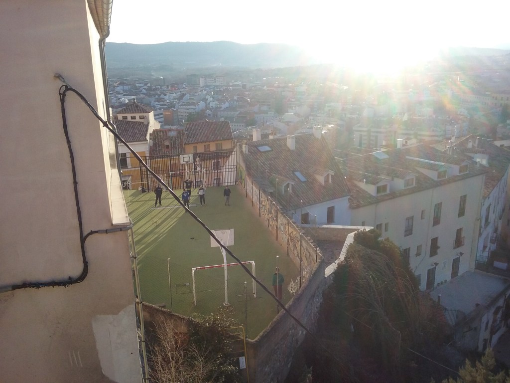 Desde el mirador de Mangana, además de una vista impresionante de la hoz del Júcar intensificando sus colores ante la caída de la tarde, pudimos ver un pequeño campo de fútbol que parecía estar incrustado entre los tejados. De adolescente soñé una vez jugar un partido de futbol entre tejados. El barco-hotel, uno de los edificios más singulares de la ciudad onírica de Xisela, con doble escalinata y ascensores en diagonal, tiene por techo un estadio.
