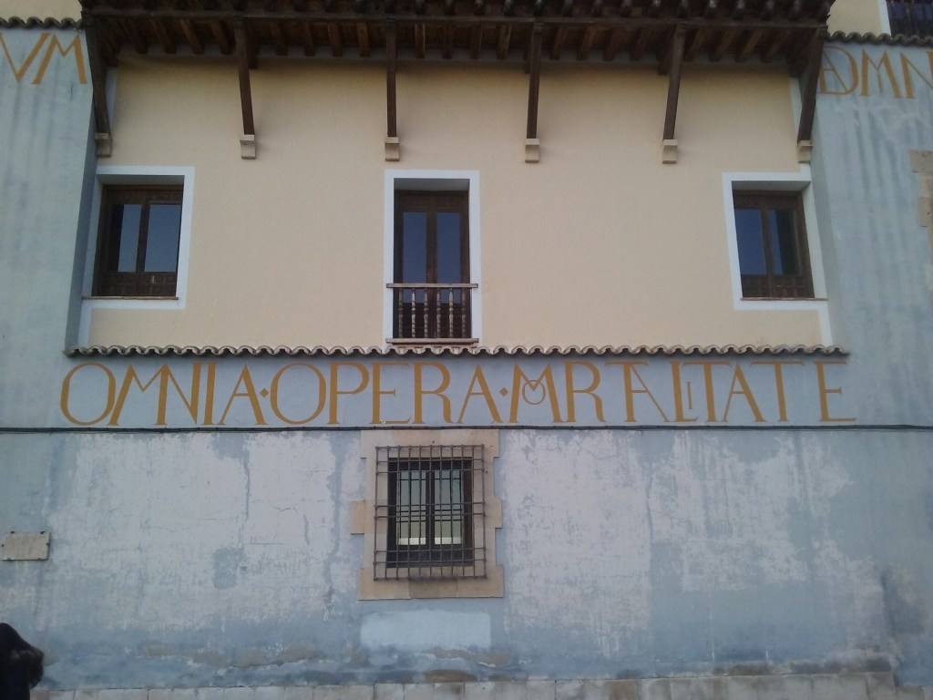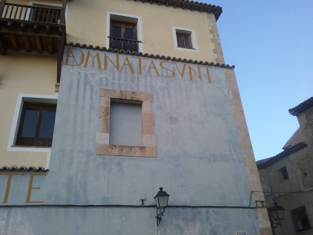 Finalmente, tras cruzar la plaza de la Catedral y deambular un rato por las callejuelas que zigzaguean a su sombra, llegamos a la Plaza de la Ciudad de Ronda, último tesoro marcado en el plano, el número cinco. Tres son los elementos desconcertantes que nos sugirieron algún tipo de vínculo con el mundo de los sueños. A la entrada de la plaza, encontramos cubos de hielo a los pies de un árbol, como si este diera frutos glaciales. Hace unos años, Xisela tuvo un sueño en el que nos encerrábamos una serie de amigos en bloques de hielo enterrados, como búnkeres, para no tener que sufrir el drama del pico del petróleo. ¿Será el fruto de la eterna juventud un fruto de hielo? ¿Sería la cascada del tesoro número 1 su fuente? A los pocos metros, de nuevo otra figura similar a los arlequines ya entrevistos por otros rincones de Cuenca, en una estampa manifiestamente onírica. Finalmente alzamos la vista y vimos la plaza entera gobernada por una inmensa frase en latín: omnia mortalium opera mortalitate damnata sunt. Un fragmento de las cartas morales de Séneca a Lucilio, que se podría traducir por “todas las obras del hombre están condenadas a perecer” y que hacía referencia al incendio que destruyó la ciudad de Lyon en el año 65. Parece que la ilusión del hielo de la eterna juventud quedaba refutada por el implacable beso de fuego del tiempo. Además, soñar mi propia muerte, de las más diferentes formas, ha sido una constante durante toda mi vida. Sin duda, algo que ha ayudado a reafirmar una conciencia de límite que considero el fondo de verdad desde el que apoyarse necesariamente para una apertura al mundo apasionada. No por casualidad el primer verso del hasta ahora único poemario que he aceptado publicar rezaba así: “morirás en solución de continuidad”.
