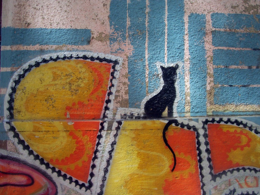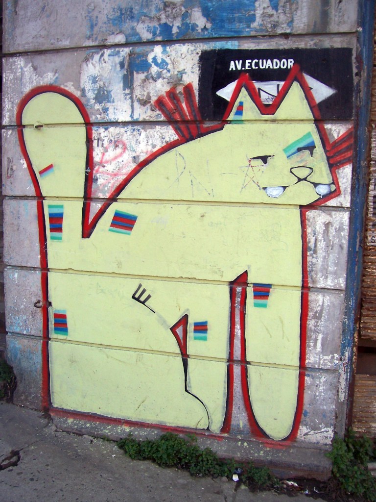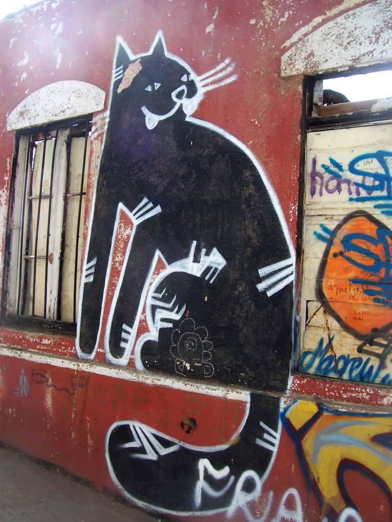 Etnografía reencantada: un dicho popular afirma que los gatos tienen siete vidas. Sin embargo, los niños de todo el mundo han comprobado más de una vez, en los descampados cobrizos, que los gatos muertos ya no juegan más. La respuesta dialéctica a esta contradicción está en Valparaíso: los gatos de todo el mundo vienen aquí a vivir sus otras seis vidas. Estás pueden tomar, indistintamente, cuerpos de dos dimensiones o de tres. Los gatos de dos dimensiones viven en superficies planas como paredes, y han sabido desarrollar nuevas estrategias adaptativas, como hacerse pasar por pinturas cuando los miran los seres humanos. Sin embargo, más de una vez, cuando uno logra regresar al mismo punto dentro del laberinto de Valparaíso, acontecimiento que parece imposible por el efecto caleidoscopio urbano que posee esta ciudad, el supuesto graffiti del gato ya no se encuentra allí: se ha marchado a otro lugar, a curiosear al borde de los problemas con sus pequeños pasitos de como puntos suspensivos puestos ahí sin ninguna pretensión.