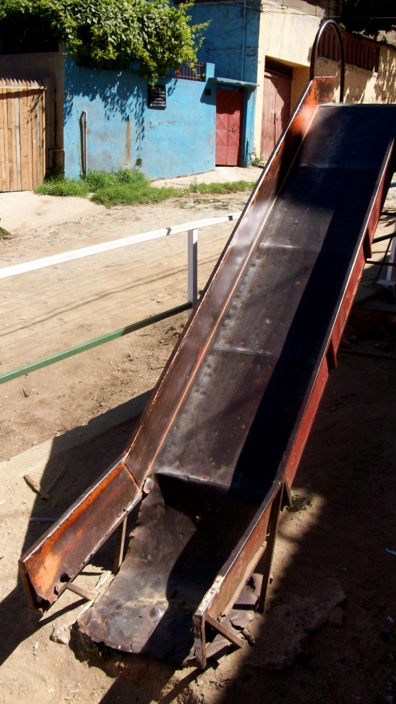 Hechos objetivos: desde cualquier mirador de Valparaíso, y analizando la disposición topográfica del terreno, muy abrupto por sus abundantes cerros, en fácil imaginar toda una serie de medidas racionales e irracionales de embellecimiento de la ciudad, como hicieron los surrealistas y los letristas con París en sus respectivas épocas. Además, Valparaíso está atravesado por una serie de ascensores muy antiguos que facilitan el acceso a la parte alta de los cerros. Sugestionados por la idea de instalar toboganes por toda la ciudad, nos hallamos con el rail abandonado de un ascensor en desuso. El abandono había provocado que en el hueco ocupado por el rail creciera la hierba, generando una especie de tobogán natural. El cerro del que se enquista estos viejos railes asilvestrados posee además, un nombre curioso: Cerro Florida. Finalmente, en nuestra última tarde en Valparaíso, seducidos por la idea de grandes toboganes en distintas modalidades (toboganes de agua, toboganes jardín) encontramos un tobogán destruido por el vandalismo.