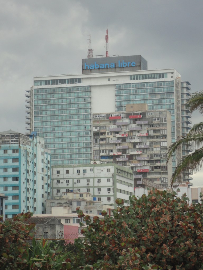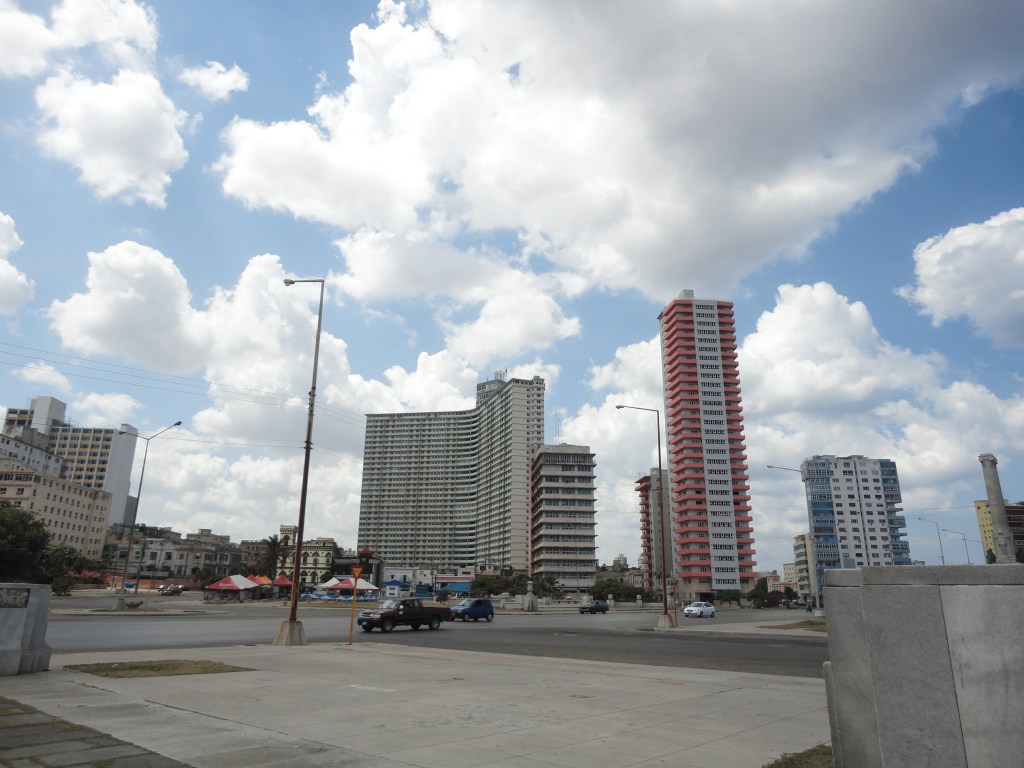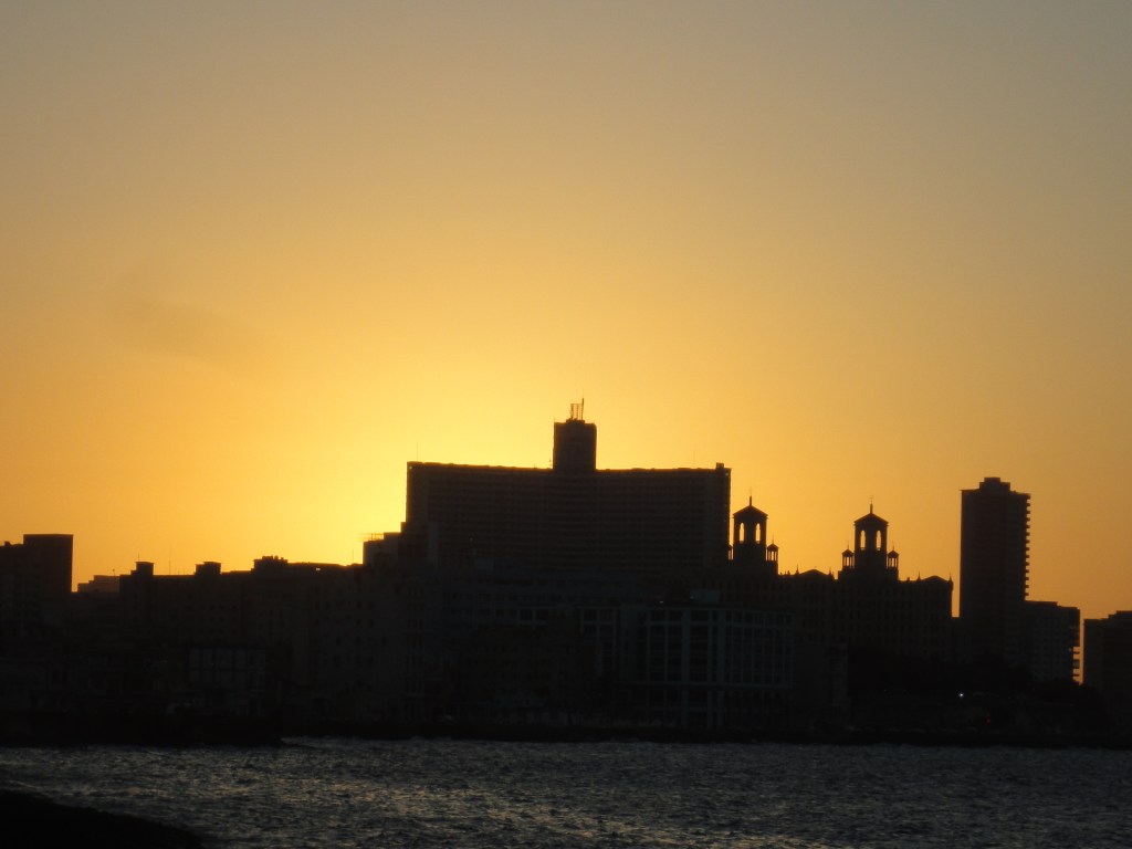 Conteniendo La Habana Vieja, Centro Habana y el Vedado está el Malecón que es un universo en sí mismo. Una larga trinchera de melancolía agradable frente al campo de batalla de las olas, que va torneando como un alfarero las caderas de arcilla de la ciudad. La triple frontera entre cielo, mar y edificios emblemáticos dibuja una silueta que funciona bien en la memoria, por eso abusan de ella los fotógrafos y los pintores de suvenires para turistas. Desde la zona de la Punta, su trazo insigne comienza con el Faro del Morro para continuar, tras el sobresalto del llamado popularmente edificio de los ataúdes, en pinceladas que suben y bajan en los edificios del Malecón histórico y sus diferentes alturas. Es un vaivén en el que suceden también las casas restauradas y las ruinas. Este dulce garabato se rompe y se disparada en el desproporcionado rascacielos hospitalario de 26 plantas Hermanos Ameijeiras, que recicla, en un gesto de propaganda arquitectónica significativa, el que iba a ser la sede del Banco Nacional de Cuba. Más allá el Malecón histórico se hace lejano. Y se alzan al fondo, como una península costera de montañas mágicas que se insinúan entre brumas marinas, el Habana Libre, el Foxa y el palaciego Hotel Nacional. Con sus dos torres campanarios para convocar, día tras día, una misa al revés. Una ofrenda a la renovación sagrada de la carne. Que el sol se ponga justo tras la silueta de este apilamiento de edificios altos y reputados, como si fuera un foco, ayuda a remarcar su protagonismo hechicero sobre el conjunto de la ciudad.