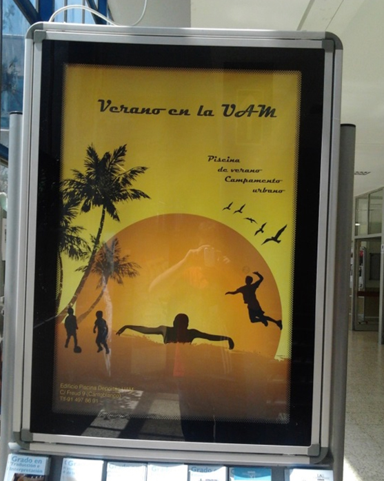El segundo fue en un cartel publicitario de la Universidad Autónoma de Madrid, en el que se animaba iconográficamente a los estudiantes a disfrutar “de los veranos de la UAM” en alguna playa caribeña y tropical a la que se debe acceder por alguno de los muchos pasillos perdidos del laberinto franquista de la Autónoma, diseñados para desorientar a las luchas estudiantiles a final de la dictadura, que todavía no hemos explorado.