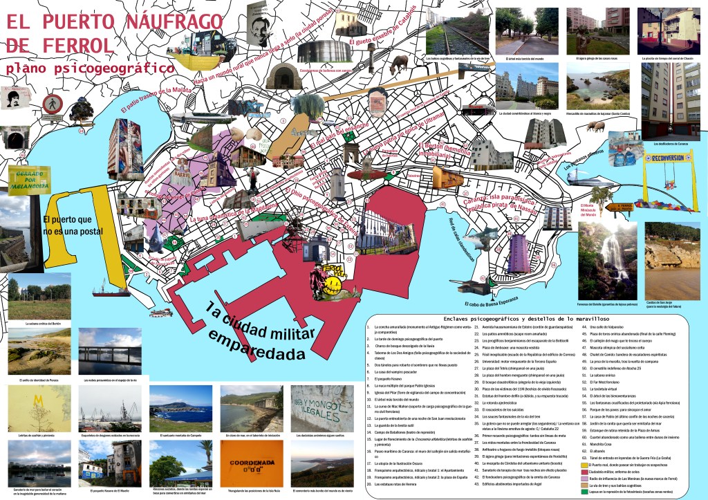 Plano psicogeográfico de Ferrol: un humilde collage que recoge algunas exploraciones poéticas de la ciudad y su entorno. El grueso de estos materiales formarán parte del capítulo El puerto náufrago de Ferrol, del libro Psicogeografía del ahí. Paseos poéticos contra la compulsión turística. Un texto que, frente a lo que indica su nombre, no quiere jugar al juego de cantar la decadencia de Ferrol (que es casi un subgénero periodístico). Al revés. Su voluntad es compartir una mirada hacia el crepúsculo industrial de mi ciudad de nacimiento que sea capaz de encontrar las líneas de fuerza de un reflote poético, vital y político, cuyo prerrequisito es romper con los cantos de las sirenas carnívoras del capitalismo neoliberal, que nos han traído hasta aquí.